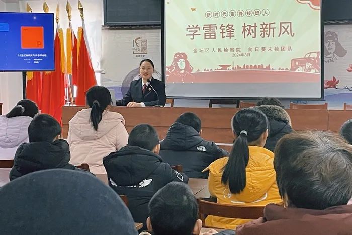 “雷锋是时代的楷模,雷锋精神是永恒的。”干警从雷锋精神的含义、时代内涵以及在当代如何践行雷锋精神等方面,生动阐释了雷锋精神。同时,将民法典、未保法中与学生息息相关的法律知识融入发扬雷锋精神的行动之中,通过互动问答的形式,激发孩子们的兴趣,引导他们增强安全防范意识和自护能力。